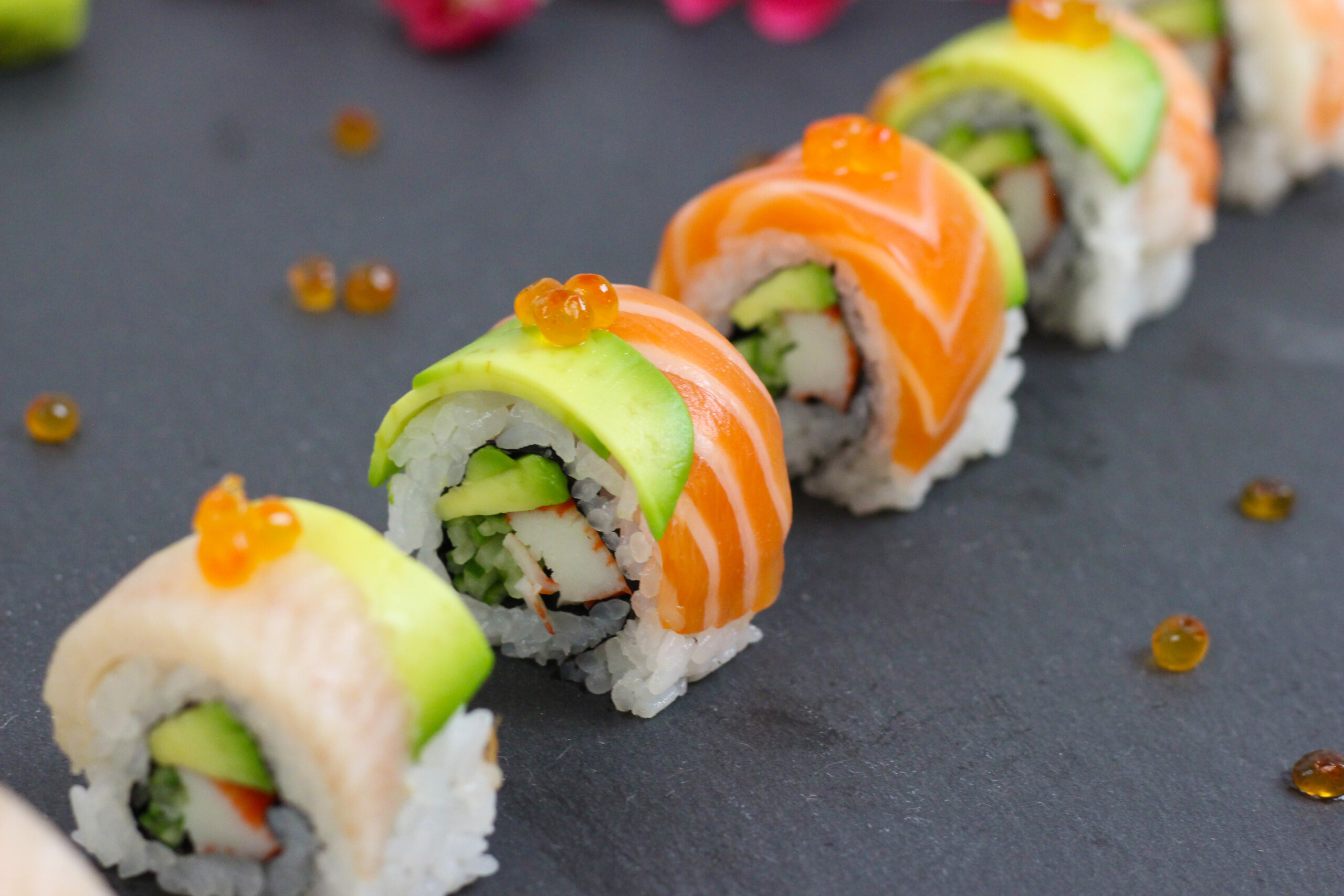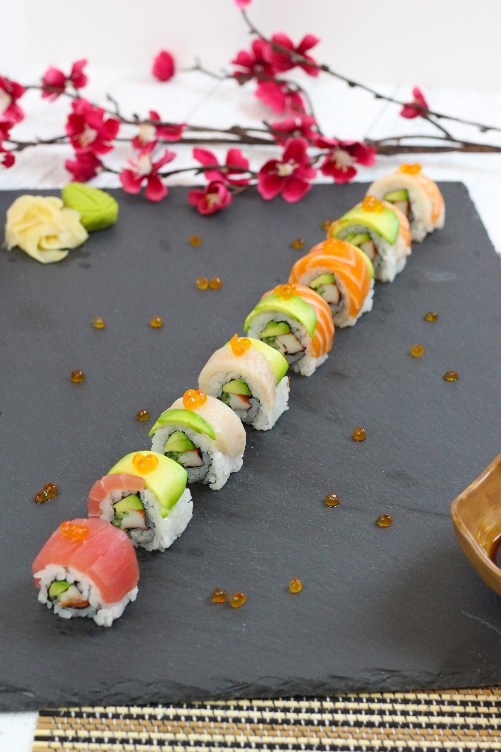 - Arrange the rolls neatly on a plate and add ikura, tobiko, or masago on top of each piece for garnish (optional).